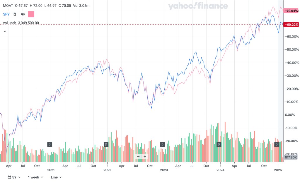 If MOAT was truly effective at picking the best undervalued companies with strong competitive advantages, we should have seen more consistent outperformance over time. But instead, we see a mixed track record, with MOAT often lagging the S&P 500.