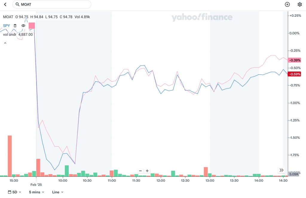 Take the most recent market drop due to President Trump imposing tariffs on Canada, Mexico and China. Looking at the chart, the SPY ETF based on S&P 500, in red, was down about the same extent as MOAT ETF, in blue. There was no real downside protection, despite its so-called focus on quality and valuation discipline.