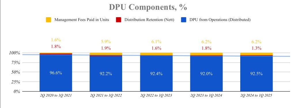 Management fees paid in units might boost distributable income in the short term, but over time, it leads to unit dilution. More units = less earnings per unit.