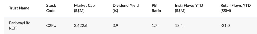 Let’s start with the numbers. Based on Bloomberg data, as of mid-May, Parkway Life REIT saw eighteen point four million dollars in net institutional inflows this year. But retail investors pulled out twenty-one million over the same period.