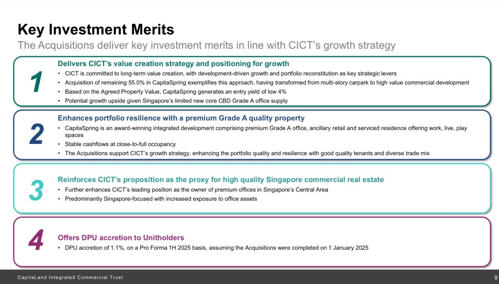 The reason this deal is happening now? The call option expires in late 2026, and management made it clear that executing the deal now, rather than waiting, avoids unnecessary market speculation and financing overhang. CICT’s share price has gone up about 17% year-to-date, which makes equity fund raising cheaper; and Singapore interest rates have also fallen, which makes debt financing cheaper too. So this could be as good a timing as it goes.