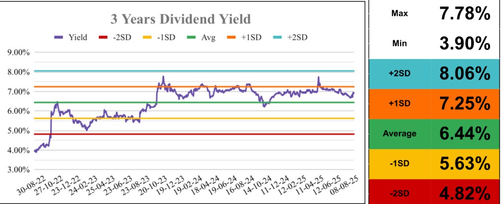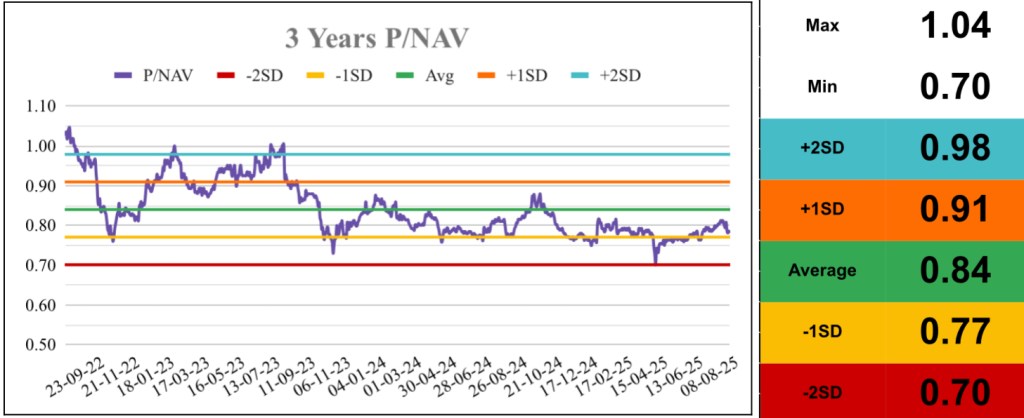 CICT’s dividend yield has now dropped below 5% once again — currently sitting at 4.9%, which is close to its 3-year low. At the same time, its price-to-NAV ratio has climbed to 1.06, the highest it’s been in three years. That means investors are willing to pay a premium for the quality, stability, and visibility that CICT offers.