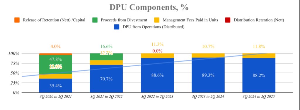 What’s interesting is that revenue still grew 3% year-on-year to $398.5 million, and total core distribution actually inched up 1% to $91.6 million. This means the drop in headline DPS isn’t from operational weakness, but more from how gains are recognised and distributed.