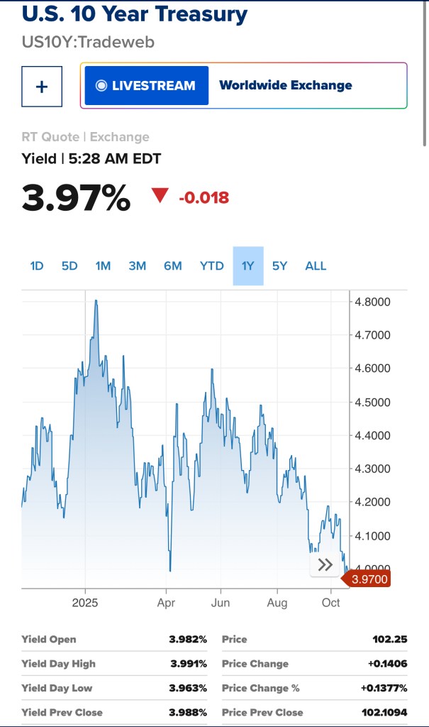 Yes, the U.S. 10-year yield falling below 4% is great news. It’s my fear index dropping, and it removes a huge headwind for REITs. Financing costs will ease, yield spreads look attractive again, and valuations have room to re-rate. That’s the core message of today’s post.