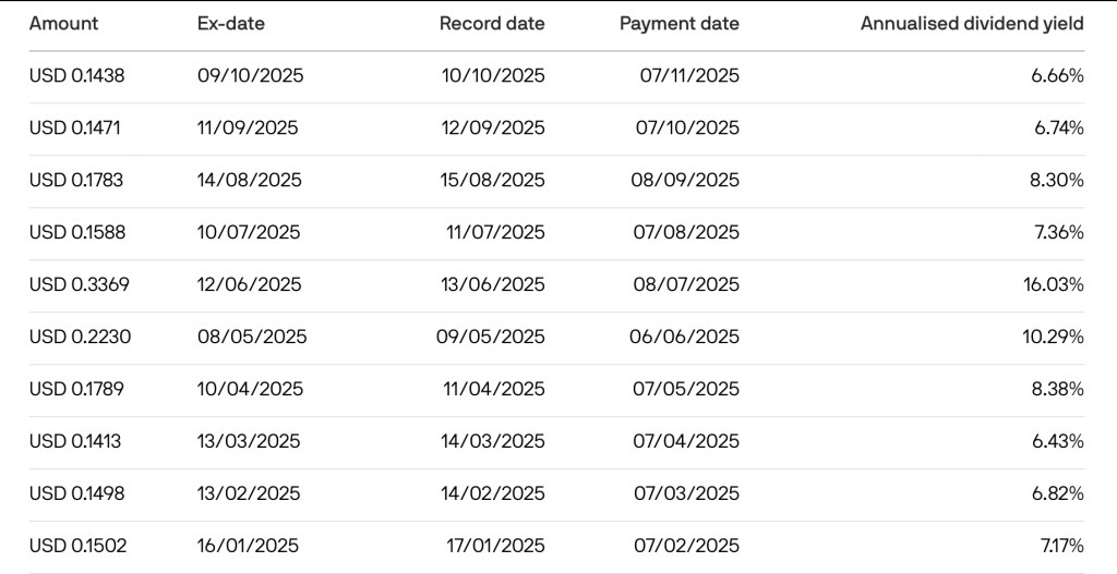 JEPG, however, continues to deliver around 7% yield, paid monthly. On top of that, the ETF has managed about 3% per annum in capital appreciation since launch 2 years ago. Put the two together, and you’re looking at a total return of around 10% per annum.