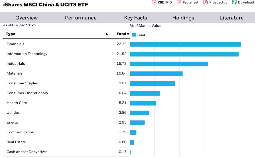 The first is CNYA, the iShares MSCI China A ETF listed in London. This ETF gives you exposure to the domestic A-share market — essentially companies that drive internal consumption, infrastructure, financial services, healthcare, and industrial growth. I positioned CNYA as the core of my China strategy, roughly 50% of my allocation, because if China’s stimulus and internal stabilisation were going to work, this is the segment that would benefit first.