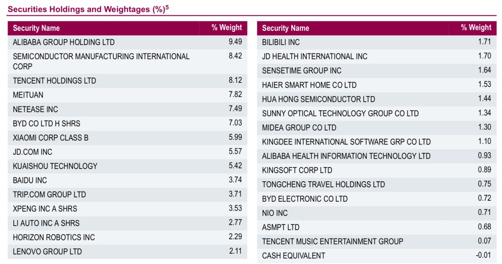 The second ETF is HST, the Lion-OCBC Securities Hang Seng Tech ETF listed in Singapore. This ETF tracks the Hang Seng Tech Index — China’s largest technology names: Tencent, Alibaba, Meituan, JD.com, Xiaomi, and so on. I allocated around 30% to HST because it represents China’s long-term innovation engine — though with more volatility. It’s where the growth potential is, but also where headlines can hit the hardest.