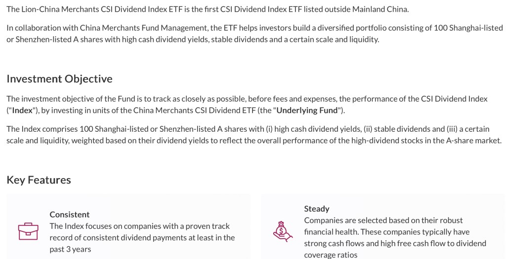 Finally, the third ETF is INC, the Lion-China Merchants CSI Dividend ETF, again listed in Singapore. This ETF targets the highest-dividend A-share companies — stable, cash-generating businesses with a track record of consistent payouts. I took around 20% exposure through INC because I wanted a stabilising layer in my China allocation — something less sensitive to tech cycles and policy noise, and offering an attractive dividend yield of around 6% based on its underlying index.