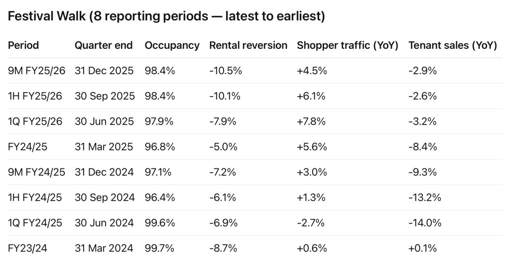 While traffic recovery is a necessary condition for improvement, it has not yet translated into earnings recovery. Until tenant sales stabilise and rental reversions flatten, Festival Walk is likely to remain a drag on portfolio-level growth.
