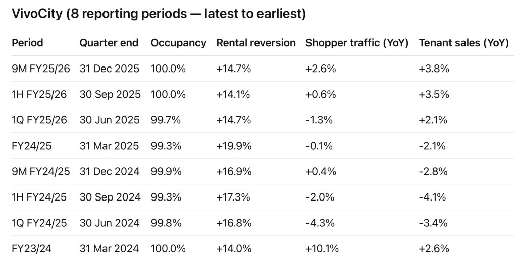 Rental reversion trends provide the strongest signal of asset quality. VivoCity delivered consistently strong positive rental reversions across all eight periods, frequently in the mid-teens and occasionally approaching 20%. This occurred even during quarters when sales and traffic were temporarily weaker, highlighting sustained tenant demand and management’s pricing power.